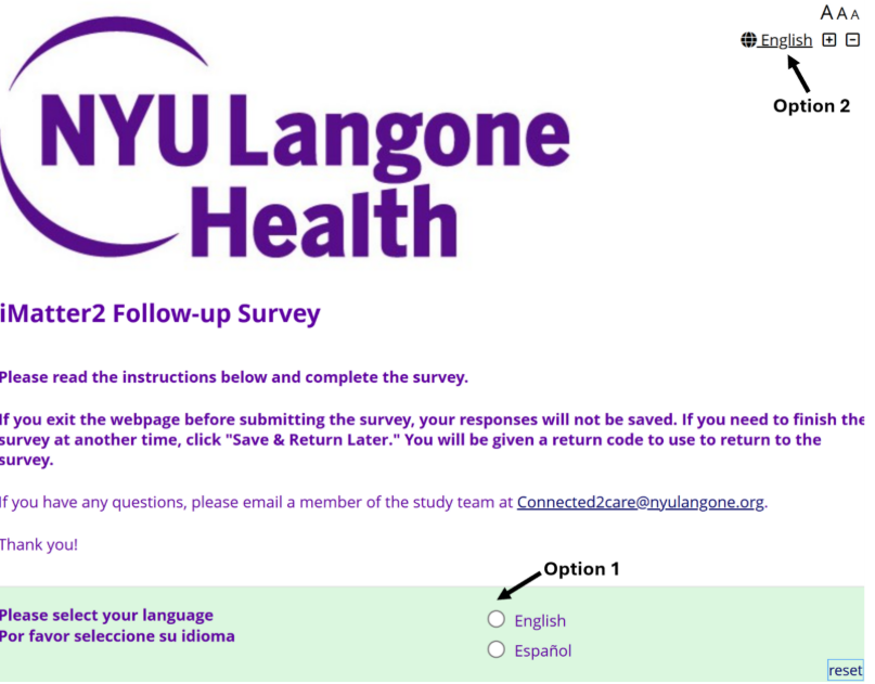 - Option 2: In the top right corner of the webpage, you can click on “English” and the option to switch language will appear beneath the survey title.